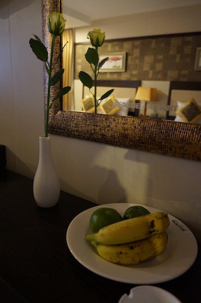 飯店贈送的水果,還有一朵白玫瑰~