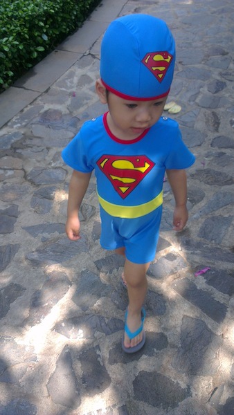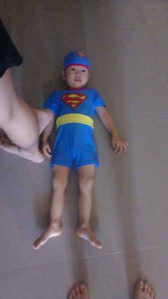 瀚瀚好久沒游水了,一換上泳衣,很開心地在地上滑來滑去,乾游,哈哈~