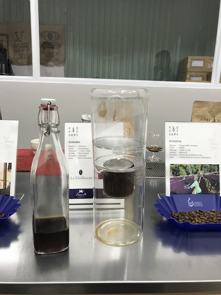 這裡現場除了販賣咖啡豆外,也有擺售一些沖煮咖啡器材及耗材,其中這個是冰滴壺,咖啡粉放在中間濾杯,上層放冰塊,靜置讓冰塊慢慢滴,冰水過濾咖啡粉,取的的咖啡可以放在冰箱一個月風味不變!大概冰滴時間需花費三個小時,也可以放在冰箱給它慢慢滴。我對這個冰滴壺相當有興趣,下次回台灣備好設備就來試試。