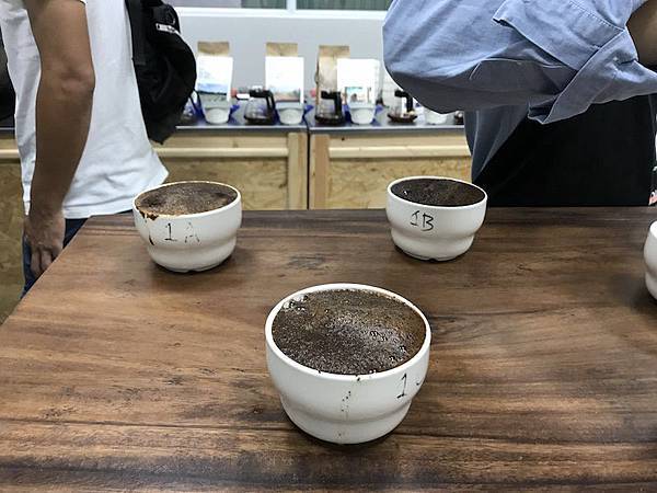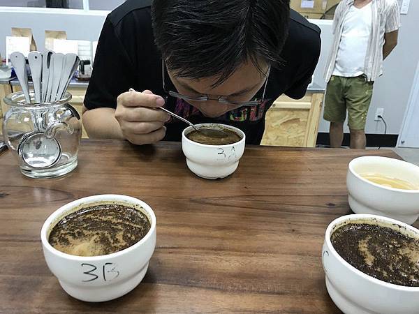 今天還有個特別的活動-三角杯測,每組有三個杯子,其中有一個杯子的咖啡豆跟其他兩個不同,透過加熱水浸泡,拿湯匙將表面的濾泡撥開,貼近杯緣聞那瞬間咖啡的味道。據專業的咖啡師施先生說,專業的咖啡師也都是這樣試豆子,而且貼近聞的方式很特別,是會在聞的那第一瞬間猛力的吸鼻子,猛一個shot一吸這樣,咖啡師有練過,我們平凡人這樣猛一吸,肯定嗆到,所以咖啡師可不是容易當的啊!