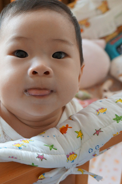 越來越可愛的瀚瀚,除了表情動作越來越豐富外,食量也漸漸增加,從前幾星期每天每次喝150c.c.(之前有點不愛喝奶),到現在突然開竅了(是開胃了吧。。),每次可以喝180c.c.以上,有時甚至到240c.c.,這幾天明顯長肉不少,唉,他媽媽的手都快廢了,腰酸背痛什麼時候才會好啊