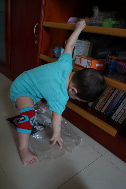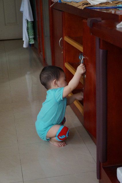 蹲下來看櫃子裡的東西。。
