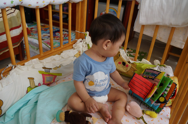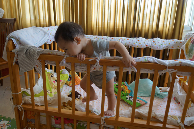 這個月的瀚瀚對於翻越床圍欄還在努力跨越中(呼可以暫時把床停在第二層,不然抱上抱下累數人)