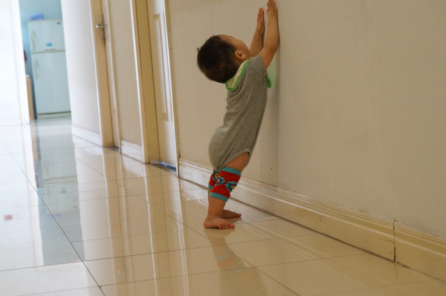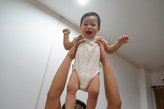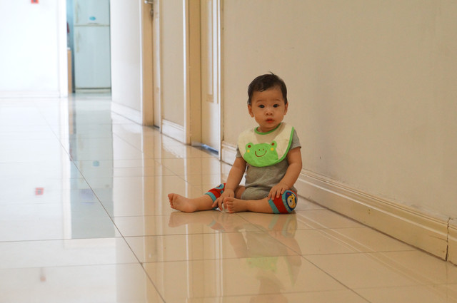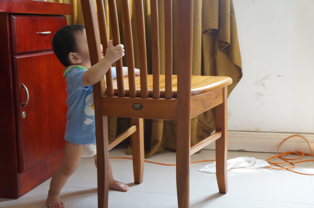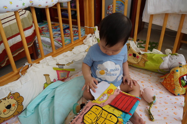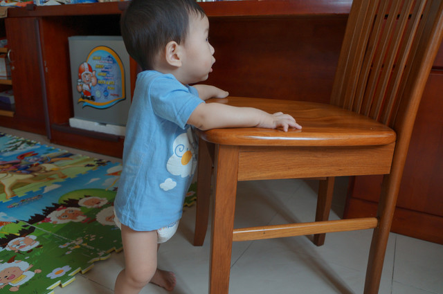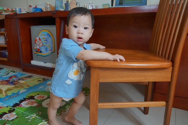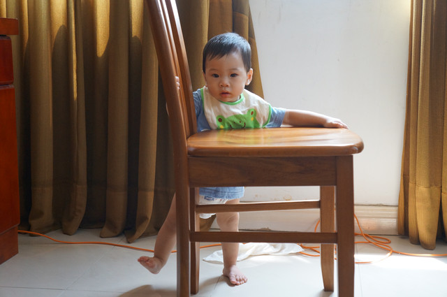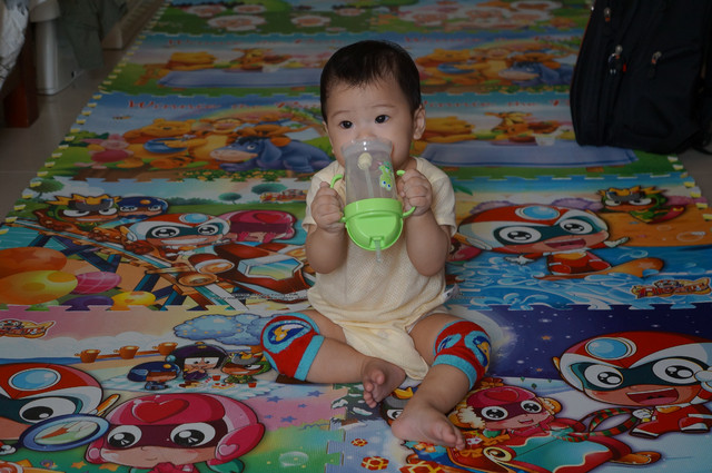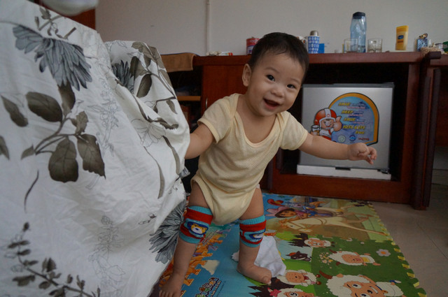 這個月活動力增強,坐著站起來越來越俐落,站著也比較穩,不怕他ㄉㄜˋ逃哉(不過如果頭往後仰,還是會不穩啦。。)