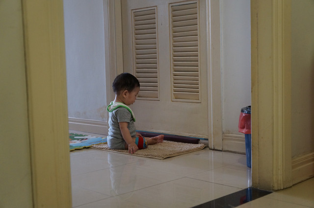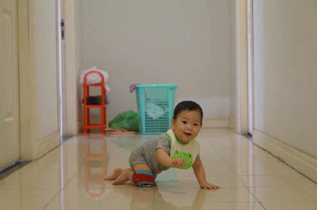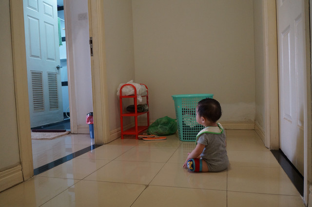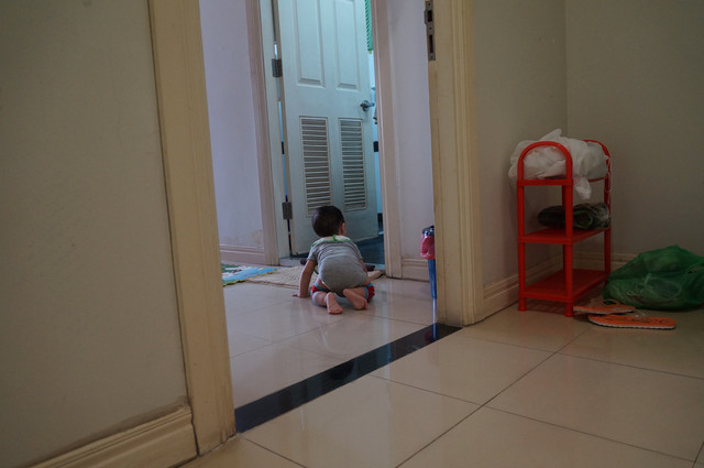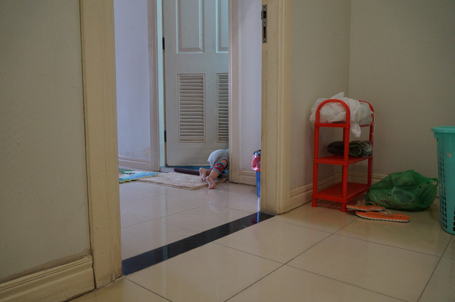 一看到房間門開著,就火速爬出去,(真的很火速,我想可以報名寶寶爬行比賽,應該成績不錯。。
