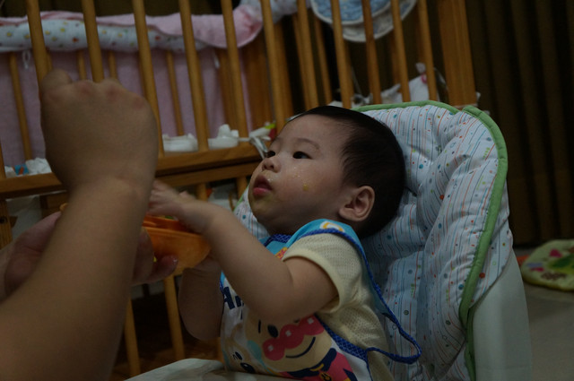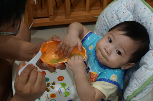 一口一口用湯匙喂,大多吃個十分鐘,就開始蠢蠢欲動,手要伸過來拿碗了