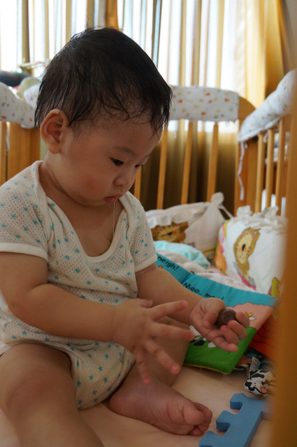 後來,我偷偷觀察,瀚瀚真的用手指,轉啊轉,把塑膠套轉了下來耶真是太聰明了。。因為我從來沒在他面前轉過這個東西,瀚瀚是哪裡來的靈感要把它轉下來的,現在還是個謎。。嬰兒的大腦真是無限可能啊!(啊我是要講幾次。。。